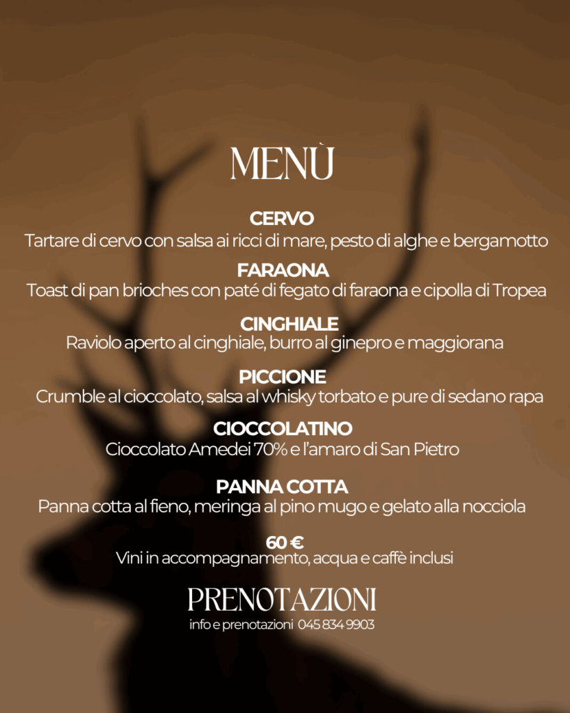 The theme of the menu will be game, a meeting point between the tradition of our beautiful Verona and the Aosta area.