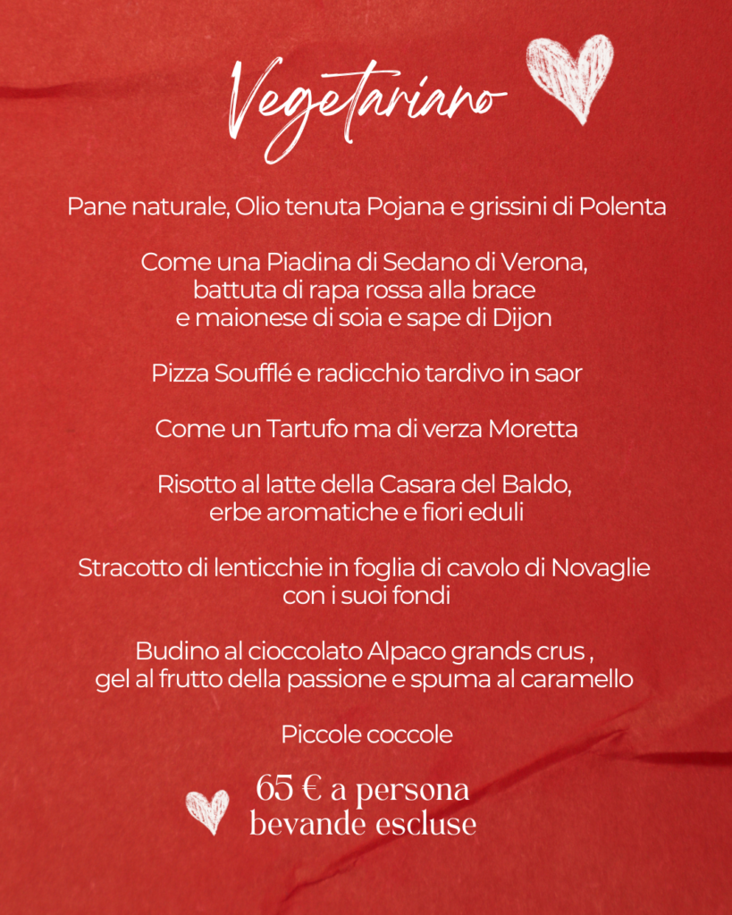 Due percorsi — uno classico e uno vegetariano — che raccontano il territorio attraverso cinque portate sorprendenti.